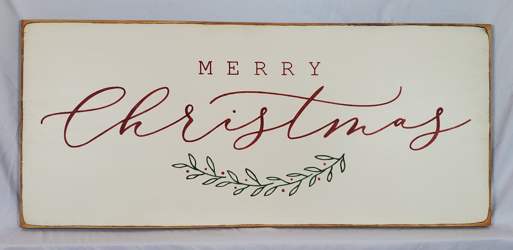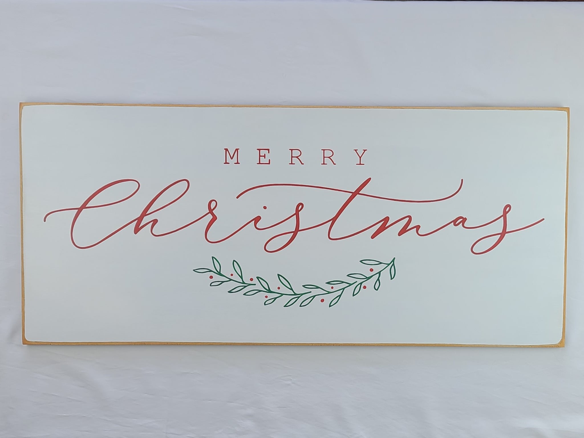 Welcome the holiday season with this beautifully handcrafted "Merry Christmas" wooden sign. Measuring 36 inches wide by 16 inches high, this vintage-style wall plaque features elegant calligraphy and is adorned with a classic design of holly leaves and berries, adding a festive touch to your home. Perfect for rustic, farmhouse, or vintage-inspired decor, this large wooden sign makes a lovely statement piece for your living room, entryway, or holiday gathering spaces. Size: 36" wide x 16" high Design: Elegant calligraphy with holly leaf and berry accents Style: Rustic, farmhouse, vintage-style Christmas decor Perfect for: Holiday wall art, festive home accents, or thoughtful Christmas gifts Add a timeless, joyful message to your home this season with this charming "Merry Christmas" foliage wooden sign!